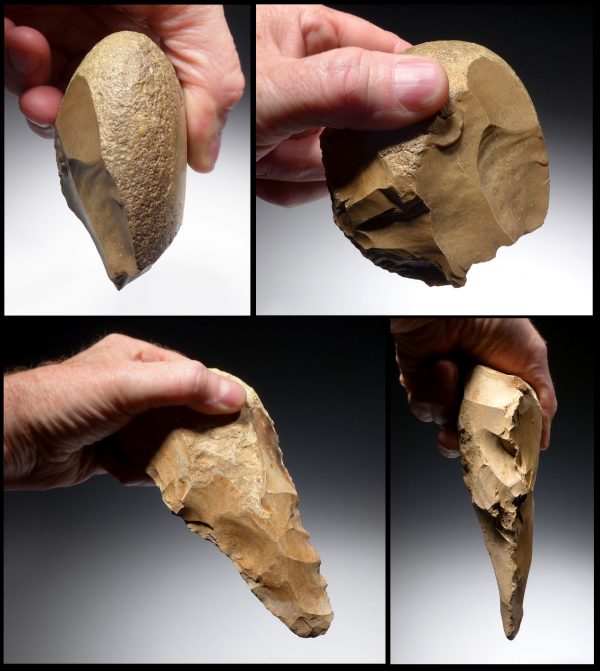 Jaren geleden (zeer recent dus) ben ik met de kinderen naar het British Museum gegaan in Londen. De aanleiding was een BBC-radioprogramma ‘De geschiedenis van de wereld in 100 objecten.’ (2010). ▶︎ In de kamer van de voorhistorische objecten zat een vriendelijke dame aan een tafeltje. Ik begon met haar te spreken over ‘de goede oude prehistorische tijd’. Ze deed haar schuifje open en toonde drie stenen. “Neem maar eens vast”, zei ze. “Deze stenen zijn miljoenen jaren geleden geslagen en geslepen door onze voorouders.” Ik heb stenen werktuigen vastgehouden van 500.000 jaar oud tot 2.000.000 oud. ▶ Het was een een verbluffende ervaring. Het lijken op het eerst zicht gewone stenen, zeker de chopper, maar zoals Kusuma Barnett, Head of Volunteers, British Museum, terecht zei in het BBC-programma: “Als je het als ik in je hand zou kunnen houden, dan zou je merken hoe comfortabel het in je handpalm past (net als een computermuis!). Je weet meteen dat dit gemaakt is om door een mens te worden vastgehouden.” Dergelijke objecten brengen de mens van heel lang geleden ineens dichtbij.