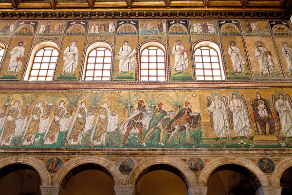 • Theodorik de Grote, koning van de Ostrogoten, maakte Ravenna tot zijn hoofdstad (493) en begint er met de bouw van het baptisterium van de Arianen, de aartsbisschoppelijke kapel en de basiliek van Sant'Apollinare Nuovo. Prachtig, prachtig, prachtig. ▶︎