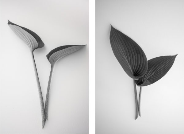 Ik dacht: ik loop even de tuin in, pluk één en ander en maak daar zo goed mogelijk foto’s van in de stijl van Karl Blossfeldt. Ik herinner me nog dat het wat knoeien was om die zachte, quasi schaduwloze achtergrond voor mekaar te krijgen in onze bijkeuken. Maar de grootste hinderpaal bleek het onderwerp. De bladeren van de hosta’s uit mijn tuin: geen enkel doorstond de kwaliteitscontrole. Natuurlijk was ik niet verwonderd dat op sommige bladeren een slakje was gepasseerd, of een rand verkleurd of dat een exemplaar wat krom was gegroeid. Wat ik niet verwachtte was dat zowat op elk blad van mijn nochtans uitbundig groeiende hosta’s iets aan te merken viel. Voor mijn geestesoog had ik volmaakte vormen gezien die in werkelijkheid niet bleken te bestaan of hoogst uitzonderlijk voorkwamen.
