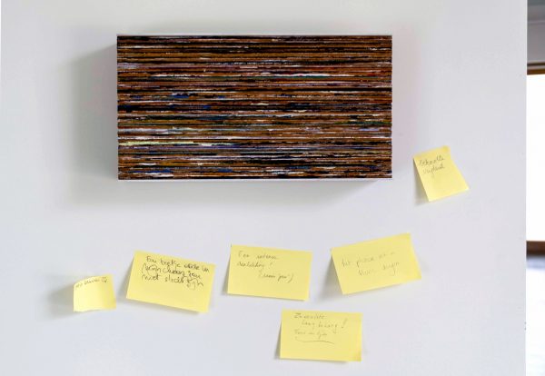 - Schrijf op een Post-it wat dit werk met je doet. Misschien roept het een herinnering op, brengt het je troost, houdt het een spiegel voor,… We vragen je dus niet om een artistieke appreciatie neer te pennen; dat mag uiteraard.
