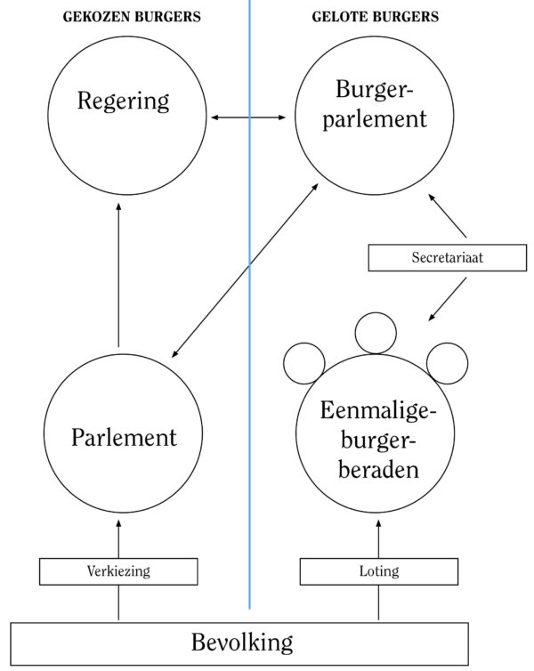 Voor alle duidelijkheid: Van Reybrouck wenst deliberatieve procedures te institutionaliseren in twee vormen: ad hoc (de thematische burgerraden) en permanent geïnstitutionaliseerd (het burgerparlement).