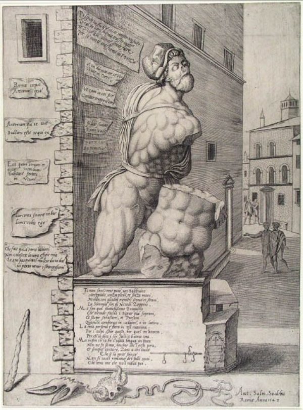 Bijvoorbeeld deze ‘pasquinade’ toen een paus het beeld in de Tiber wilde laten gooien.
