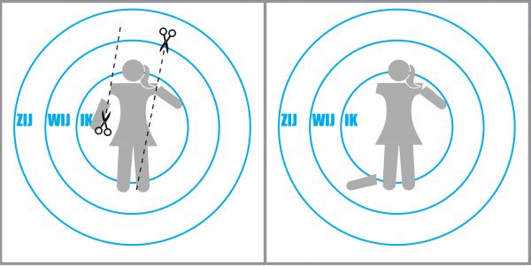 Deze verbondenheid, en dus ook de onderbreking ervan, speelt zich af in drie sferen: de verbinding met jezelf (ik), de verbinding met anderen (wij) en de verbinding met de wereld (zij).