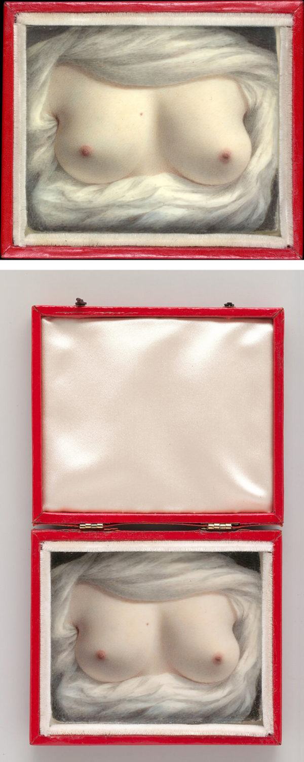 De meest beroemde intieme miniatuur is Beauty Revealed van de Amerikaanse kunstenares Sarah Goodridge (1788-1853). In 1828 schilderde ze een provocerend zelfportret. Enfin, een portret van haar ontblote borsten. Het is piepklein - slechts 6,7 x 8 centimeter en zit ‘verstopt’ in een leren etui dat met twee slotjes kan worden verborgen. Ze verstuurde het naar haar minnaar, Daniel Webster, na de dood van zijn eerste vrouw. Dit is proto-sexting: een schandalig pikant en anoniem naakt sturen naar je minnaar. Anoniem voor ons, maar niet voor de Webster: boven de linkerborst zie je een kleine moedervlek dat zegt: “Kijk Daniel, jij kent dat vlekje. Deze prachtige borsten zijn van mij, Sarah.” Dat ze haar blousse opzij schuift, als een gordijn bij een toneelvoorstelling, verhoogt enorm het zinnenprikkelende karakter van haar geschenk.