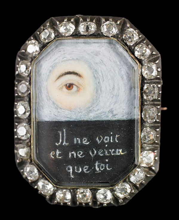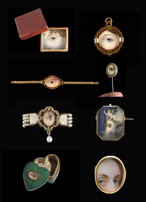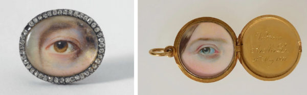 Dergelijke oogminiaturen zijn kleine juweeltjes, een paar centimeter groot, meestal op ivoor geschilderd met waterverf. De minuscule oogjes vind je terug in broches, ringen, chokers, hangers en zelfs houders voor tandenstokers. Soms zijn ze omringd door parels, als teken van verdriet omdat de geliefden niet bij elkaar kunnen zijn. Sommige afgebeelden zijn gekend. Bijvoorbeeld: Lord Byron (links) of Koningin Victoria (rechts).