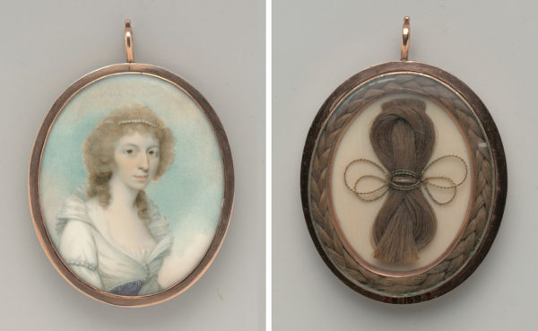 Dergelijk oogminiatuur was een teken van genegenheid tussen geliefden, soms ook tussen vrienden of familieleden. Het blijft meestal raden naar de identiteit van schenker. Hij of zij was enkel bekend bij de ontvanger en de afgebeelde. Dergelijke miniaturen overbruggen de afstand tussen de schenker en de ontvanger, wanneer die afstand een absolute of relatieve, want geheime, realiteit is. Ze vervulden dezelfde emotionele behoefte als de meer traditionele aandenkens, zoals medaillons of miniaturen met een afbeelding of wat haarlokken van een al of niet overleden geliefde. Zoals hieronder: een miniatuur (7 cm hoog) met op de voorzijde een afbeelding en op de achterzijde haarlokken van de geliefde. Maar er is meer aan de hand, zoals we zullen zien.