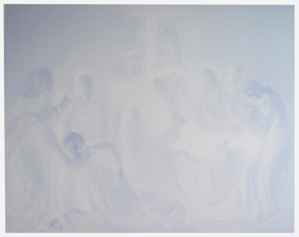 Bijvoorbeeld in het beeldend werk van de Argentijnse schilder José Marchi, met name het schilderij Kénosis uit de reeks Terra Celeste. We herkennen een verre echo van Rogier van der Weydens Kruisafname. Het lichaam van Christus is echter afwezig. Wat blijft, is wit: een stralende leegte die het centrum van het beeld inneemt. Die leegte is geen gemis, maar een dragende aanwezigheid. In Kénosis wordt ontlediging zichtbaar: het loslaten van macht, vorm en ego. Zelfs het handschrift van de schilder Marchi trekt zich terug — geen zichtbare penseelstreek, geen expressief gebaar. Het Ik verdwijnt ten gunste van het werk.