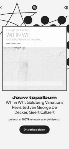 BOVENAAN MIJN SPOTIFY-LIJSTJE staan twee namen die op het eerste gezicht weinig met elkaar te maken lijken te hebben: Johann Sebastian Bach (1685-1750) en George De Decker (°1951). Dat Bach en De Decker samen op dat lijstje belandden, is geen toeval. De Decker is de componist van het album dat ik dit jaar het vaakst beluisterde: Wit in Wit. Goldberg Variations Revisited — een opname uit 2018-2019 [1].