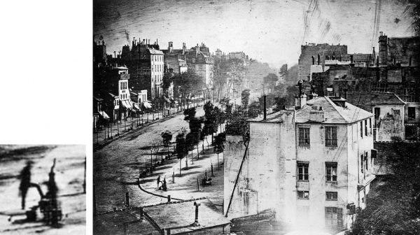 Daguerre maakte vanuit het venster van zijn studio een opname van de Boulevard du Temple (Parijs). We zien een lege straat. Maar dat is maar fotografische schijn. De straat was niet leeg; het drukke verkeer is echter niet te zien omwille van de lange belichtingstijd (±10 minuten). Daardoor worden enkel statische elementen (bomen, huizen, …) vastgelegd op de foto.