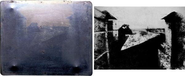 Nu we toch bezig zijn: dit is de oudste bewaarde foto uit de geschiedenis. Point de vue du Gras, gerealiseerd door de uitvinder Nicéphore Niépce in 1827. De door hem gebruikte belichtingstijd wordt geschat tussen tussen 8 uur en enkele dagen. Links de bewaarde foto; rechts een verbeterde afbeelding.
