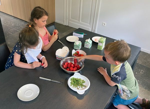 Aardbeien ’ontkronen’ en in de mixer. Suiker en room erbij.