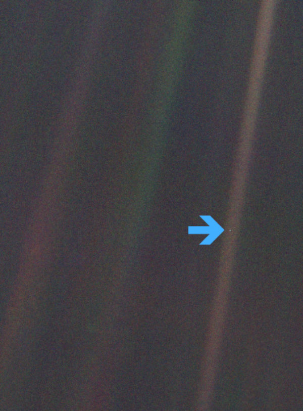 Deze foto werd op 14 februari 1990 gemaakt vanaf de ruimtesonde Voyager 1. Het Voyager-team stond op het punt om de camera’s van de Voyager voorgoed uit te schakelen om energie te sparen voor de lange reis die nog voor de boeg lag. De NASA gaf de opdracht om de camera van de Voyager 1 richting Aarde te draaien en een foto te nemen.