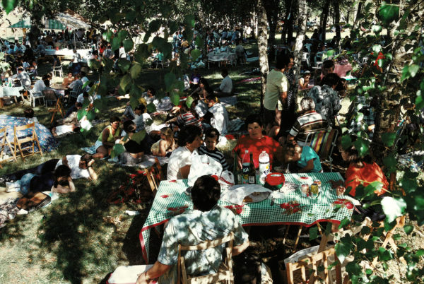 Over de foto zegt Gruyaert zelf: “Ik was met de auto onderweg in Extremadura, in Spanje, toen ik werd aangetrokken door geluid dat klonk als een groot feest. Ik parkeerde de auto en klom op een heuvel. Ik had een perfect zicht op wat er aan de gang was: een grote groep mensen die aan het picknicken waren.