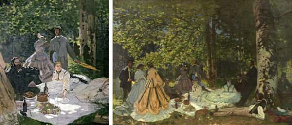 De foto doet denken aan een van de eerste schilderijen die Monet heeft gemaakt: Le Dejeuner sur l’herbe uit 1865. Er rest ons nog alleen een deel van het oorspronkelijk schilderij (links) en een schets van het geheel (rechts). De gelijkenis is opvallend.