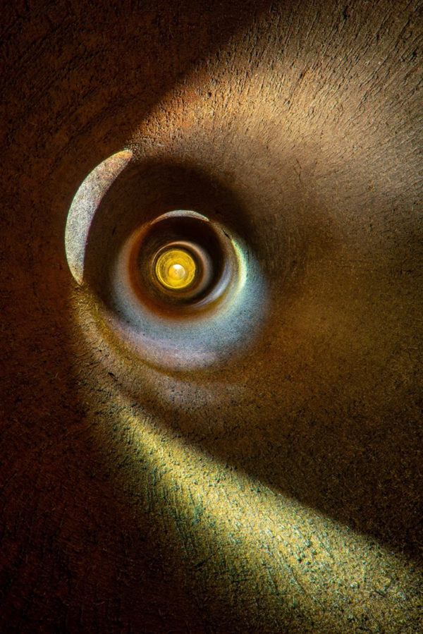 Daaraan moet ik denken bij het zien van de foto’s van de Nieuw-Zeelandse Charles Brooks over de architectuur van muziekinstrumenten. Als gereputeerd klassiek cellist die overal in de wereld heeft gespeeld, evolueerde hij tot een wereldvermaard fotograaf. Voor zijn reeks ‘Architecture in music’ laat Charles Brooks zich inspireren door muziekinstrumenten (uiteraard). Zijn benadering was hoogst uitzonderlijk. Tijdens de covidquarantaine fotografeert hij met een sondelens de binnenkant van instrumenten. De band tussen het kleine en het grote is onmiddellijk duidelijk. De binnenkant van instrumenten krijgen de allure van bijzondere architecturale ruimtes of van vreemde ruimte-universa. In een interview vertelt Charles Brooks dat zijn fascinatie voor astrofotografie een inspiratiebron was. En zo combineerde Charles Brooks zijn liefde voor muziek en zijn liefde voor fotografie in een verbazend geheel.